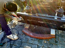 В углу участка делаем лавочку. Брусчатку под её ножками зачищаем, всё выставляем по уровню, для дополнительной надёжности конструкция удерживается е только на клею, но и на штырях. Параллельно делаем верх одного из памятников.